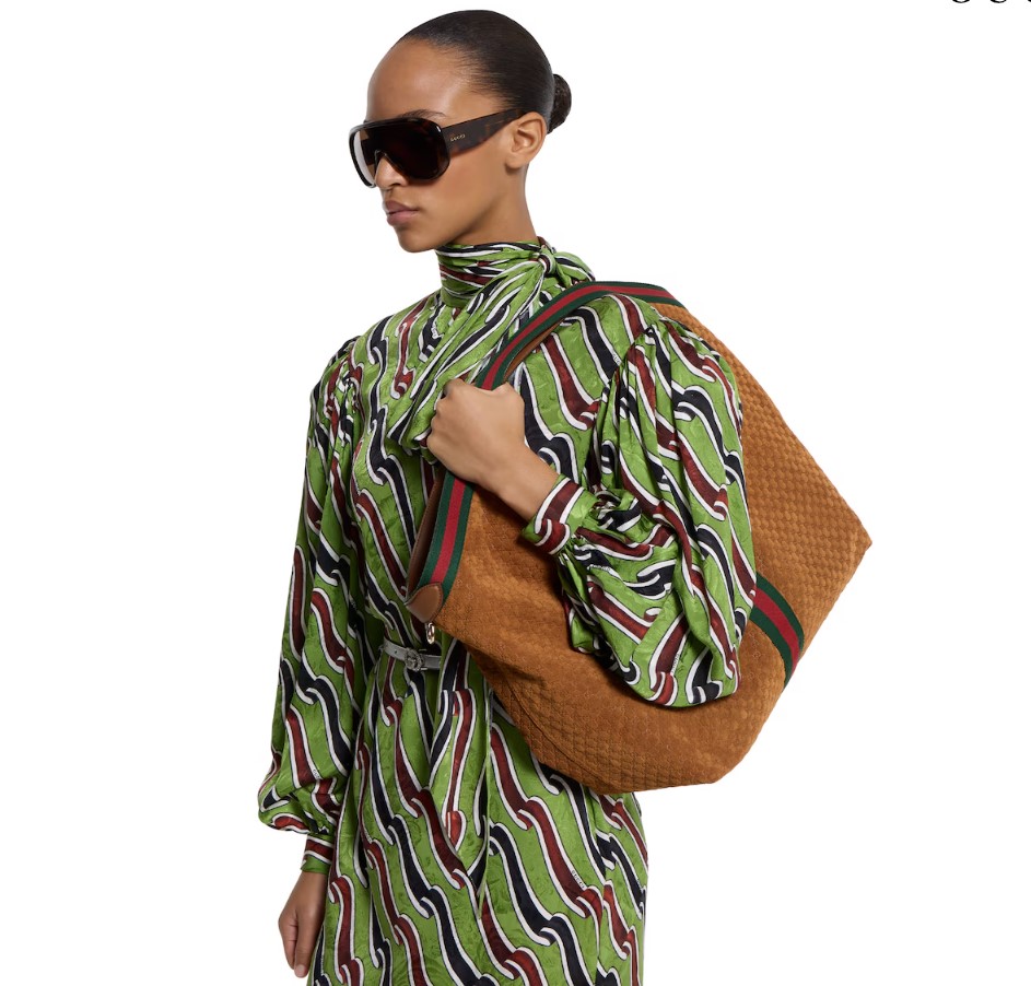 Continuing the spirit of reinvention, Gucci Giglio reinterprets the House’s emblematic GG motif with sumptuous materials and rich colors that speak to the season. Crafted in GG suede, this capacious bag features the Web trim, and is complete with a detachable pouch.
