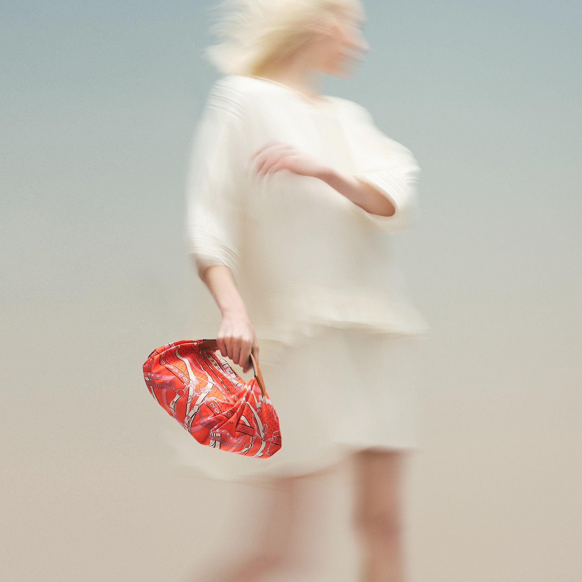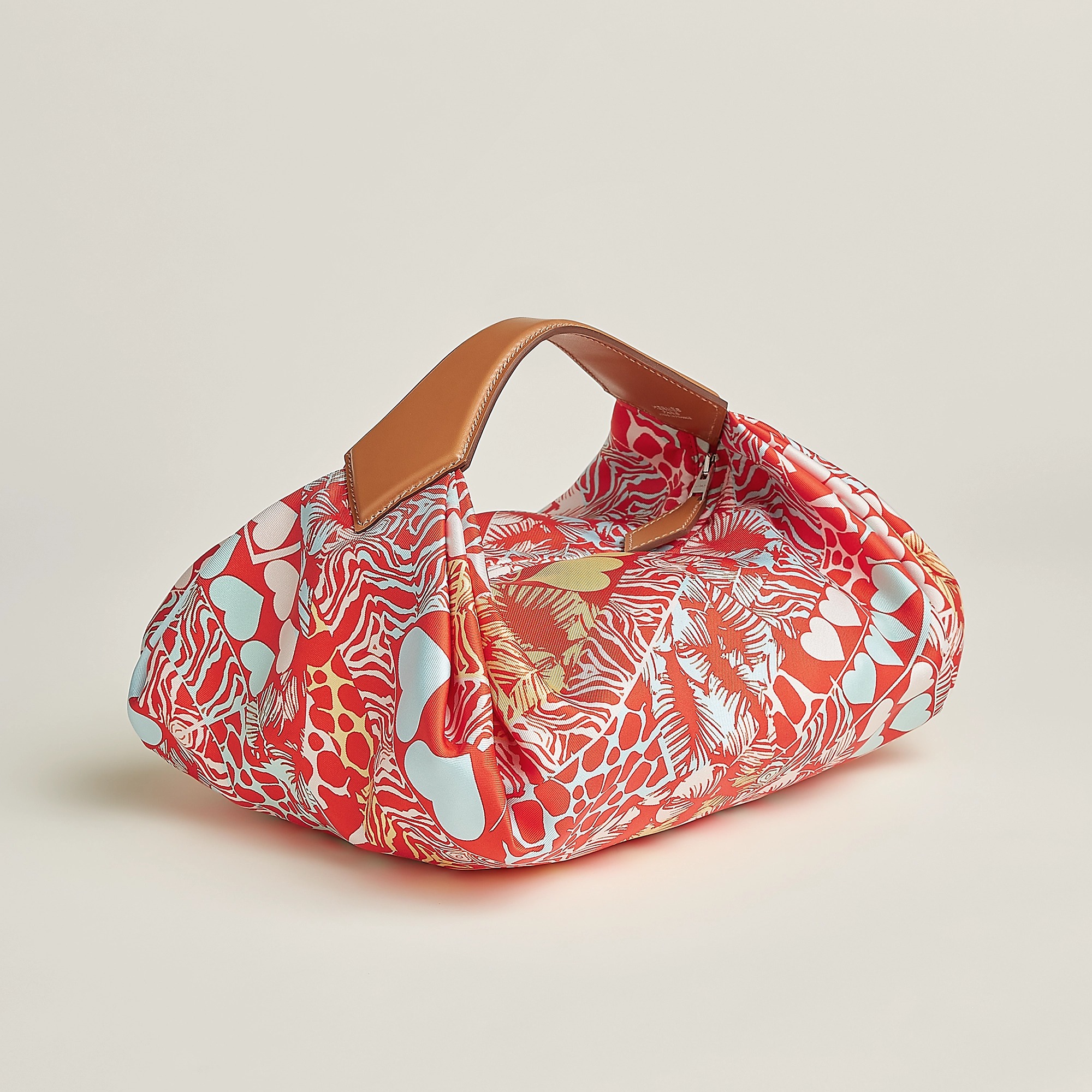 The bag has a structured yet softly folded silhouette, giving it a modern, sculptural shape. Its surface design features a vibrant equestrian-inspired print, showcasing motifs such as ropes, chains, and buckles — commonly associated with classic luxury scarf patterns.